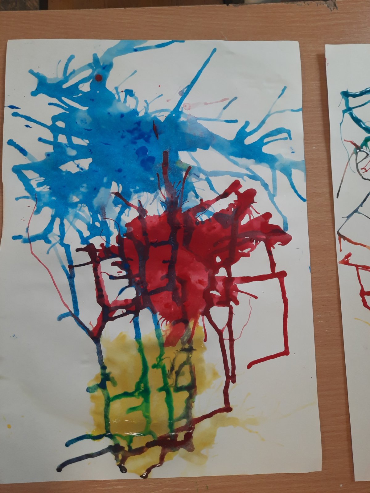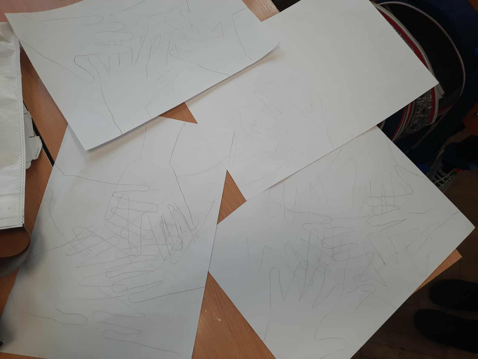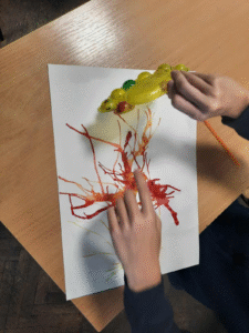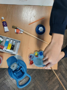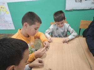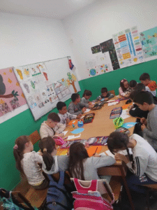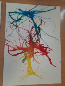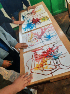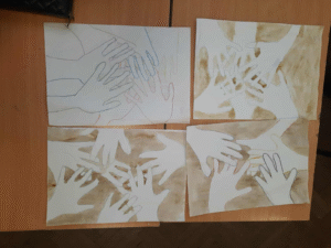 Ученици виших разреда на ликовној радионици су своје ликовне радове израђивали дувањем боја сламчицама помоћу темпера, комбинованом техника бојења природном бојом (кора ораха) на тему “Уплети руке”, као и на тему “Зажмури и нацртај” помоћу темпера.