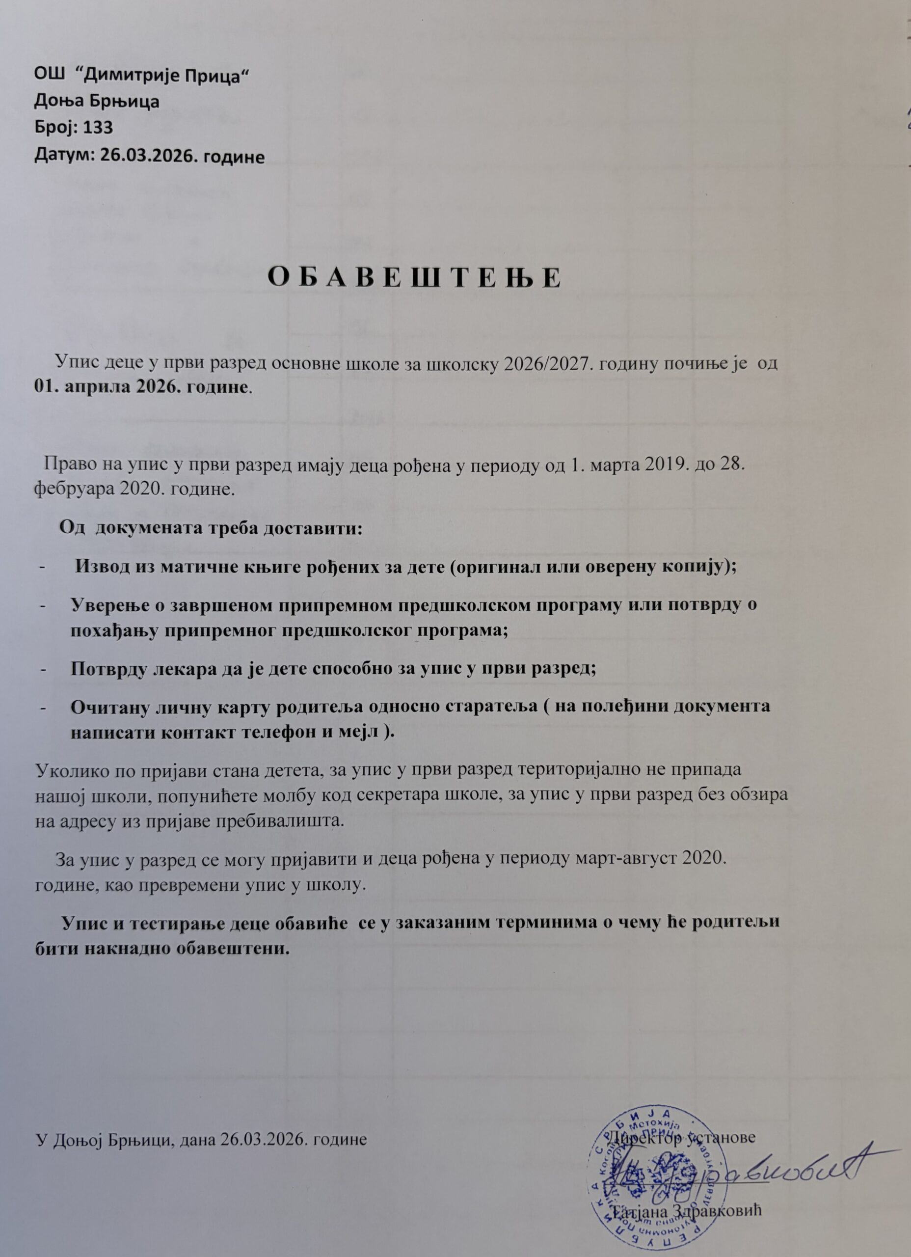 Обавештење о упису деце у први разред за школску 2026/2027. годину